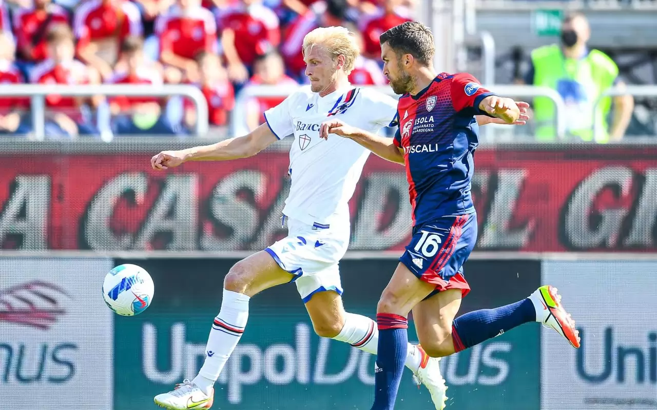 Morten Thorsby scored his first goal in of the 2021/22 Serie A season with a twisting, diving header, pulling one back against Cagliari. However the goal only served as a consolation, with the home team grabbing all three points.