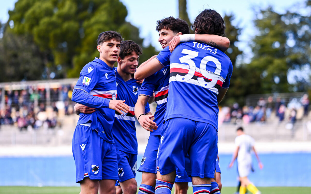Ennesimo rotondo successo per la Sampdoria di Tufano che al “Bibolini” di Lerici si impone 4-0 sulla Carrarese e accede ai quarti di finale della 73.a Viareggio Cup. Prima frazione equilibrata in cui le due squadre si fronteggiano su buoni ritmi. Blucerchiati insidiosi con Leonardi che in ben due circostanze, al 15’ e al 46’, chiama agli straordinari Gatti. Gialloblù invece pericolosi al 37’ con Prevedello che dalla distanza non sorprende Gentile e al 41’ con Tortelli che di testa centra un palo. Rientriamo in campo con maggior determinazione e al 15’ la sblocchiamo con il solito Leonardi che da posizione defilata insacca. Continuiamo a premere e al 21’ raddoppiamo con Portaccio che dal limite sferra una conclusione forte e precisa che si infila all’angolino. Quest’ultimo al 32’ si procura un calcio di rigore che Leonardi si incarica di realizzare per il 3-0. Nel finale, c’è tempo al 34′ per l’espulsione dell’ex Chaabti, autore di un fallo di reazione, e del secondo centro di Portaccio, che al 41’ fissa il punteggio sul definitivo 4-0. Testa ora a giovedì pomeriggio, quando scenderemo in campo nuovamente al “Bibolini” di Lerici (ore 15.00) per affrontare i campioni in carica del Sassuolo.