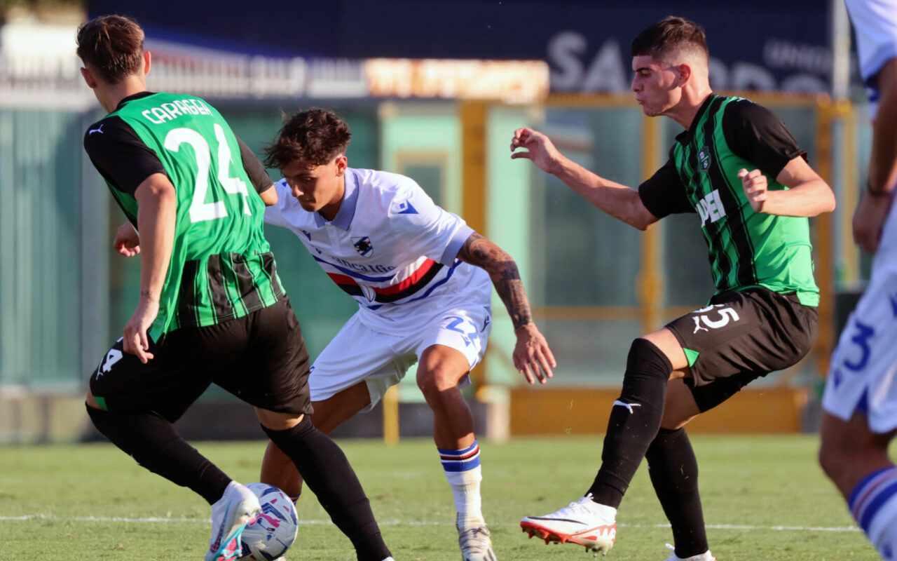 Tre gol non bastano alla Sampdoria di Sassarini, sconfitta 4-3 dal Sassuolo al “Ricci” nella gara d’esordio del campionato Primavera 1 TIM 2023/24. Partiamo forte e, dopo aver sfiorato il vantaggio con una conclusione ravvicinata di Alesi respinta d’istinto da Theiner, al 5′ sblocchiamo la contesa con Ntanda che con il destro spedisce il pallone nell’angolo più lontano. La reazione nerazzurra è immediata: sugli sviluppi di una punizione, Caragea batte Scardigno dall’interno dell’area e pareggia i conti. Al 21′ Caragea ruba il tempo a Costantino e di testa supera ancora il nostro numero 1: risultato ribaltato ma solo per pochi miniuti. Al 37′ infatti è capitan Conti ad inserirsi con i tempi giusti e a ristabilire nuovamente la parità, prima che Alesi al 45′ rovesci nuovamente il punteggio con un calcio di punizione che termina sotto il sette.