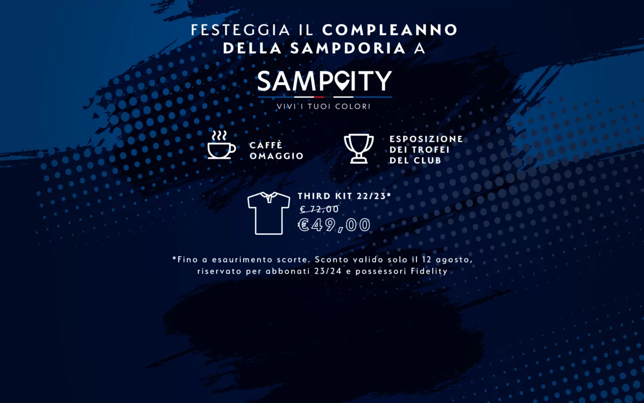 Kit. Nello shop al piano inferiore infine tutti gli abbonati 2023/24 e i possessori di fidelity (SampCard e DoriaCard) potranno acquistare ad un prezzo scontatissimo il third kit 2022/23 (49 euro anziché 72, fino ad esaurimento scorte). Vi aspettiamo numerosi.
