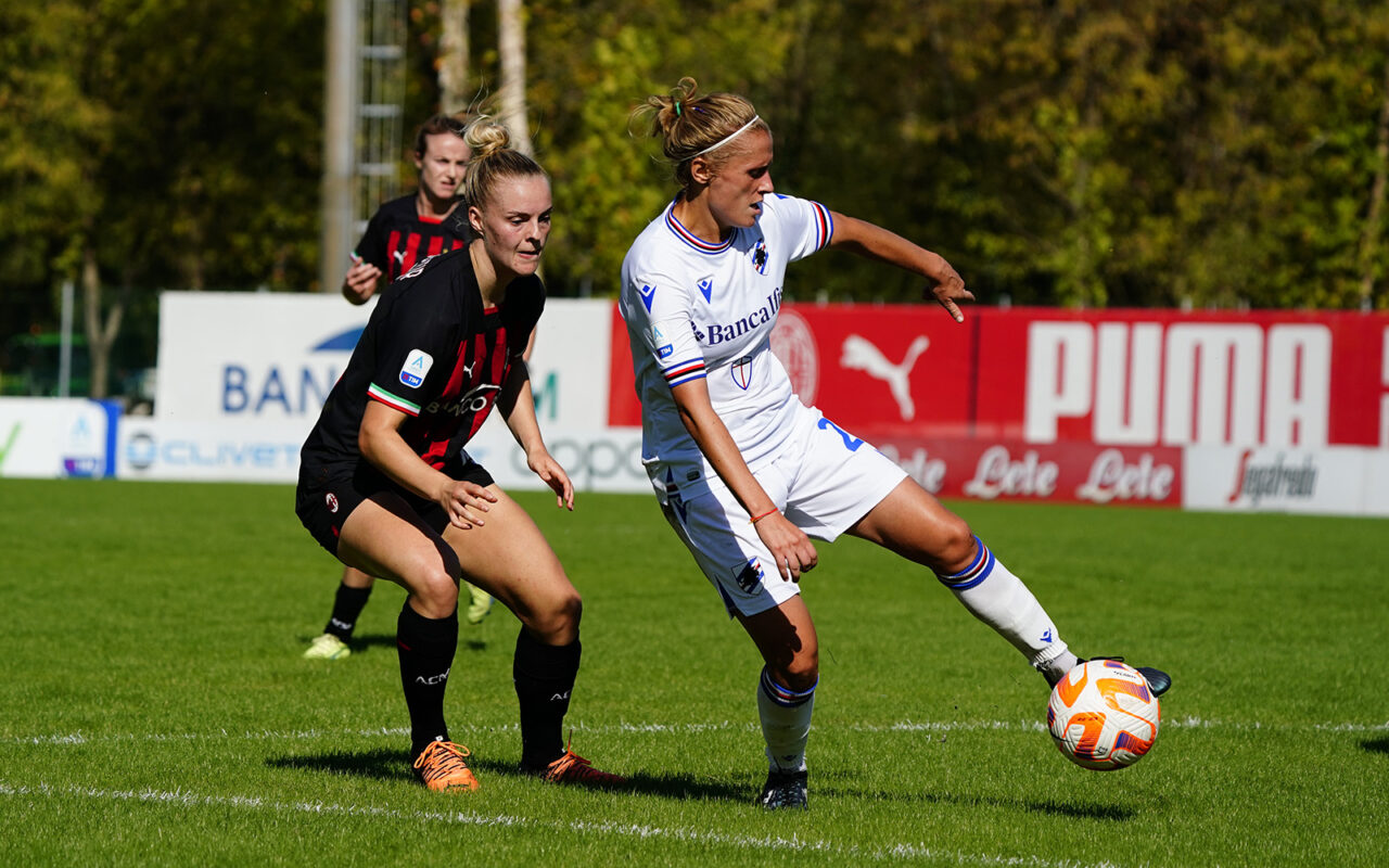 Secondo stop consecutivo per la Sampdoria Women. Al “Vismara” di Milano le blucerchiate subiscono la rimonta del Milan, che nella ripresa si impone per 2-1. La partenza è doriana: un lancio lungo di Spinelli al 3′ trova la spizzata di Tarenzi, Baldi è bravissima a raccogliere, a saltare con una magia difensore e portiere, e ad accomodare in porta lo 0-1. Alle rossonere però bastano quattro giri d’orologio per ristabilire la parità: su cross di Bergamaschi, Asslani anticipa tutti e insacca il pareggio. Il Milan ci prova poi con Asslani (21′ e 32′) e Thomas (41′), la Samp con Gago (41′) e Rincón (45′), ma si va negli spogliatoi sull’1-1. Al 3′ del secondo tempo è il Milan a portarsi sopra: Dubcova calcia dal limite, Asslani ci mette lo scarpino, fa doppietta e completa la rimonta. Le padrone di casa non si accontenano: Re salva con un colpo di testa un tiro al volo di Dubcova (7′) e al 16′ Odden fa muro su Thrige. Al 28′ è insidiosissima Rincón su punizione: Giuliani non si fa sorprendere. Le ragazze di Cincotta ci provano fino alla fine, ma non c’è niente da fare: Milan-Samp finisce 2-1.